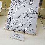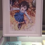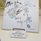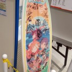 Le reste de l’exposition était beaucoup plus « basique » dans sa composition puisque nous y retrouvions divers objets provenant du studio comme des shikishi dédicacés par des membres du staff, des bluray, figurines ou d’autre goodies plus improbables comme une planche de surf aux couleurs de la série… qui était dédicacée.